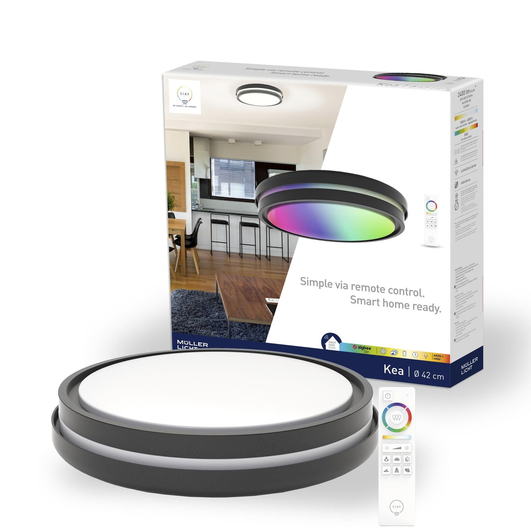 • Intuitiv steuerbar über mitgelieferte tint Fernbedienung ‒ voreingestellte Lichtszenen von „Romantik" bis „Party", individuell einstellbare Lichtgruppen