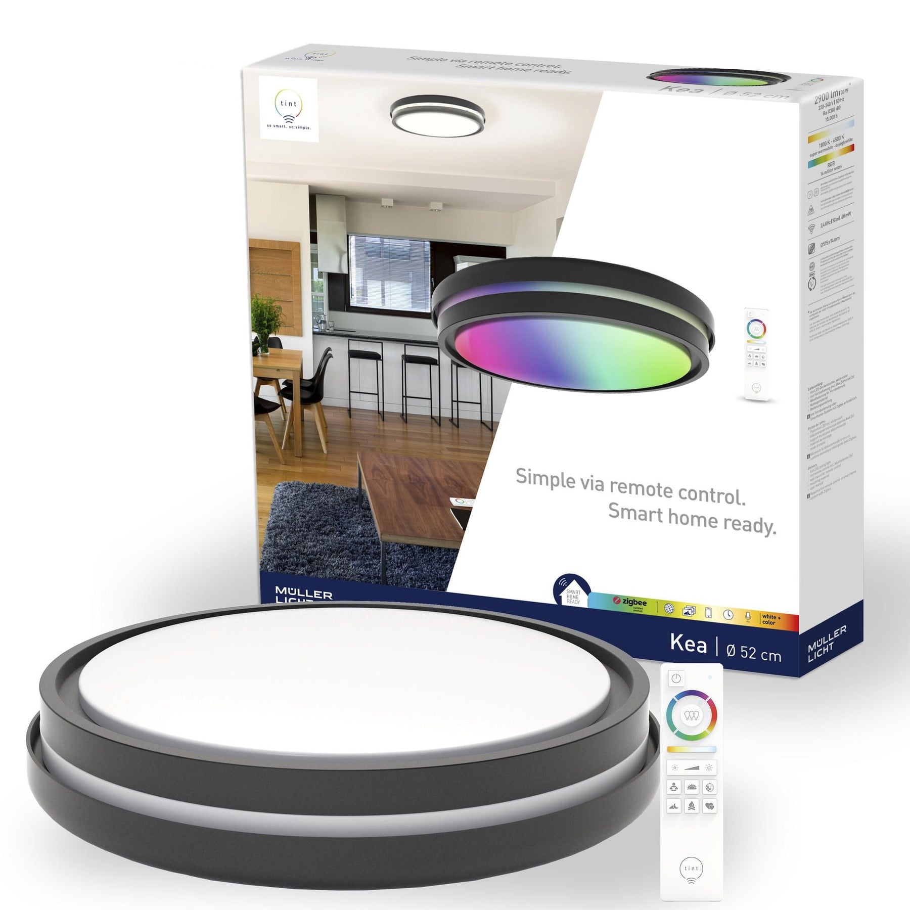 - Smarte tint LED-Deckenleuchte Kea white+color von MÜLLER-LICHT, Durchmesser 52 cm: Weißtöne von superwarmweißem Licht (1800 K) bis hin zu aktivierendem Tageslicht (6500 K) sowie farbiges Licht RGB (bis zu 16 Mio. Farben)