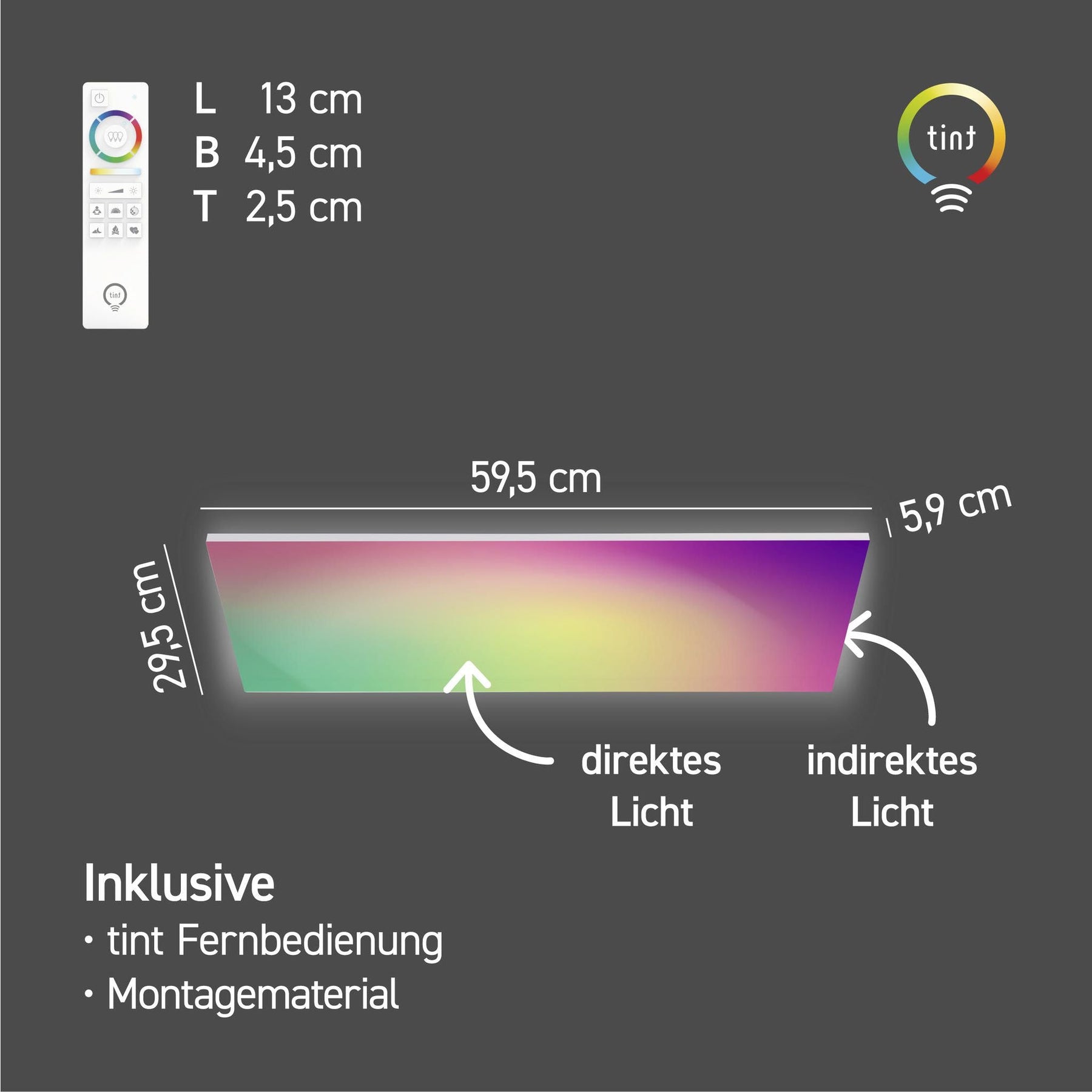 - Direkte und indirekte Beleuchtung in der jeweils gewählten Lichtfarbe, stufenlos dimmbar, zum Beispiel per tint Fernbedienung (nicht mit herkömmlichen Dimmern steuerbar)