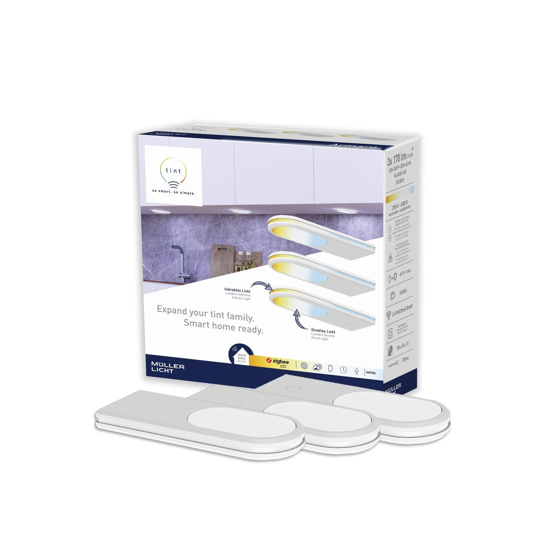 Mit den smarten tint LED-Unterbauleuchten Armaro white sorgst du in der Küche oder an Regalen für optimale Lichtverhältnisse und höchsten Lichtkomfort. Die LED-Leuchten im 3er-Set lassen sich ohne komplizierte Installation oder Downloads zum Beispiel über die tint Fernbedienung bedienen. tint white sorgt für verschiedene Weißtöne und sorgt so immer genau für die richtige Stimmung. Wähle zwischen gedimmtem, warmweißem Licht für eine behagliche Atmosphäre zum Dinner oder tageslichtweißem Licht, das sich ideal zum Kochen eignet. Zusätzlich zur direkten Beleuchtung sorgt ein seitlicher Leuchtstreifen für schönes, indirektes Licht in modernem Design. Wie du dein Licht steuerst, überlassen wir dabei dir. Starte zum Beispiel ganz einfach, ohne Internetzugang, über die tint Fernbedienung und stelle verschiedene Weißtöne sowie voreingestellte Lichtszenen ein: Ob belebendes Arbeitslicht, entspannter Sonnenuntergang oder beruhigendes Nachtlicht – tint ist sofort startklar und sorgt immer für die richtige Stimmung. Einfacher geht’s nicht. Dank der intelligenten Dual-Chip-Technologie mit Zigbee und Bluetooth kannst du deine Beleuchtung wahlweise auch per Bluetooth über die kostenlose „tint Smart Light“ App steuern. Hierfür benötigst du keine weiteren Geräte und kannst sofort loslegen. Dank ZigBee 3.0 ist tint darüber hinaus in gängige Smarthome-Systeme mit Zigbee-Gateway einbindbar und bietet damit viele weitere Funktionen, wie zum Beispiel die Zeitsteuerung oder Kontrolle von unterwegs. tint hört außerdem aufs Wort: Steuere dein Licht bequem per Amazon Alexa mit allen Echo-Geräten mit integriertem Zigbee Smarthome-Hub, zum Beispiel Echo 4. Generation oder Echo Plus.