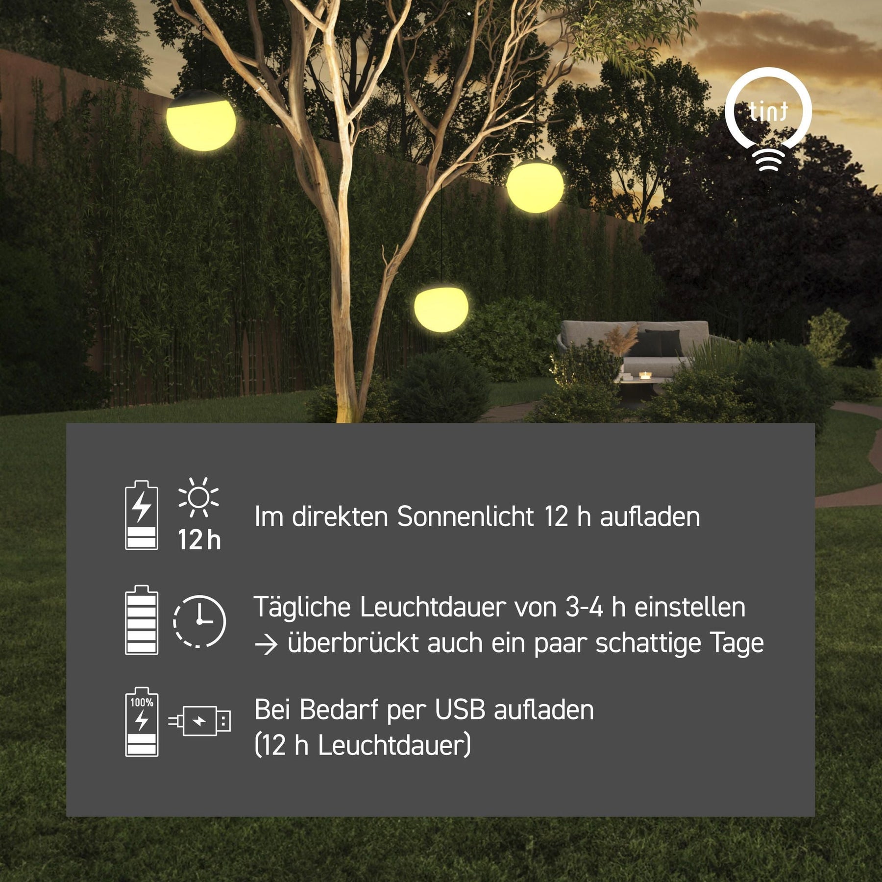- Innovative Solartechnik ermöglicht das freie Platzieren der smarten LED-Leuchtkugel. Optional per USB-C aufladbar.